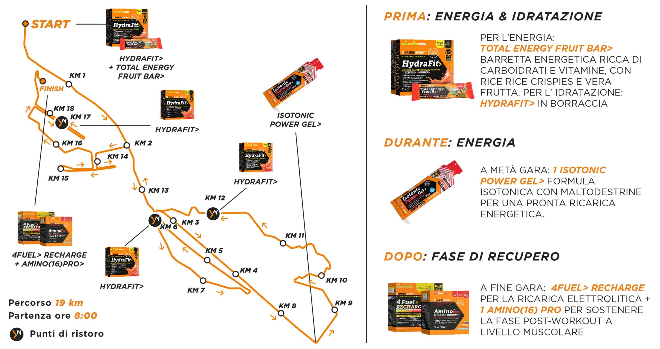 - A metà gara: 1 Isotonic Power Gel, formula isotonica con maltodestrine per una pronta ricarica energetica.